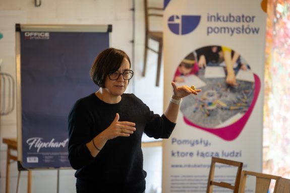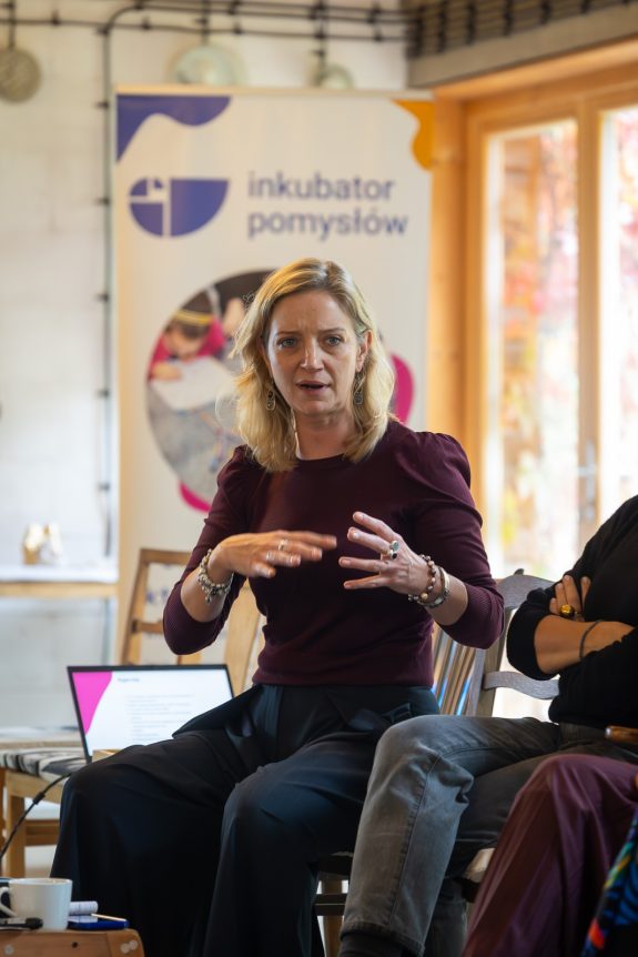 Część spotkania była okazją do rozmowy i wymiany doświadczeń z doświadczoną innowatorką i innowatorem społecznym – Katarzyną Karską oraz Tomaszem Frejtagiem. Oboje od lat tworzą i rozwijają autorskie innowacje społeczne, a w Oczyszczalni podzielili się refleksjami z własnej drogi, opowiedzieli o wyzwaniach, satysfakcji i o tym, jak utrzymać energię w procesie tworzenia.